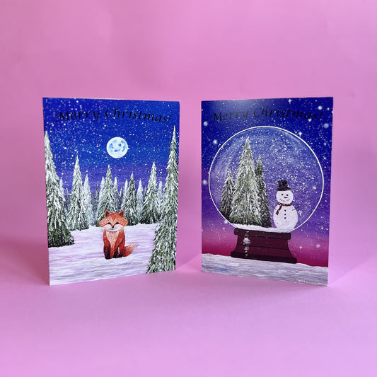 Christmas Card Pack, Snowman & Fox Designs, Acrylic Painting Christmas Cards Set, Snowglobe Card, Fox Card