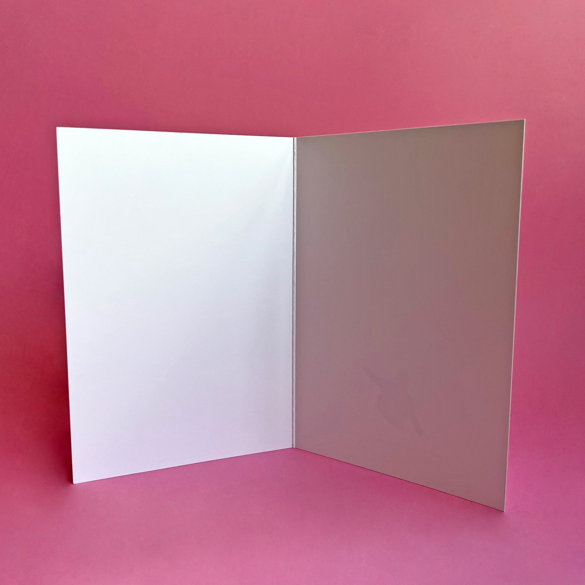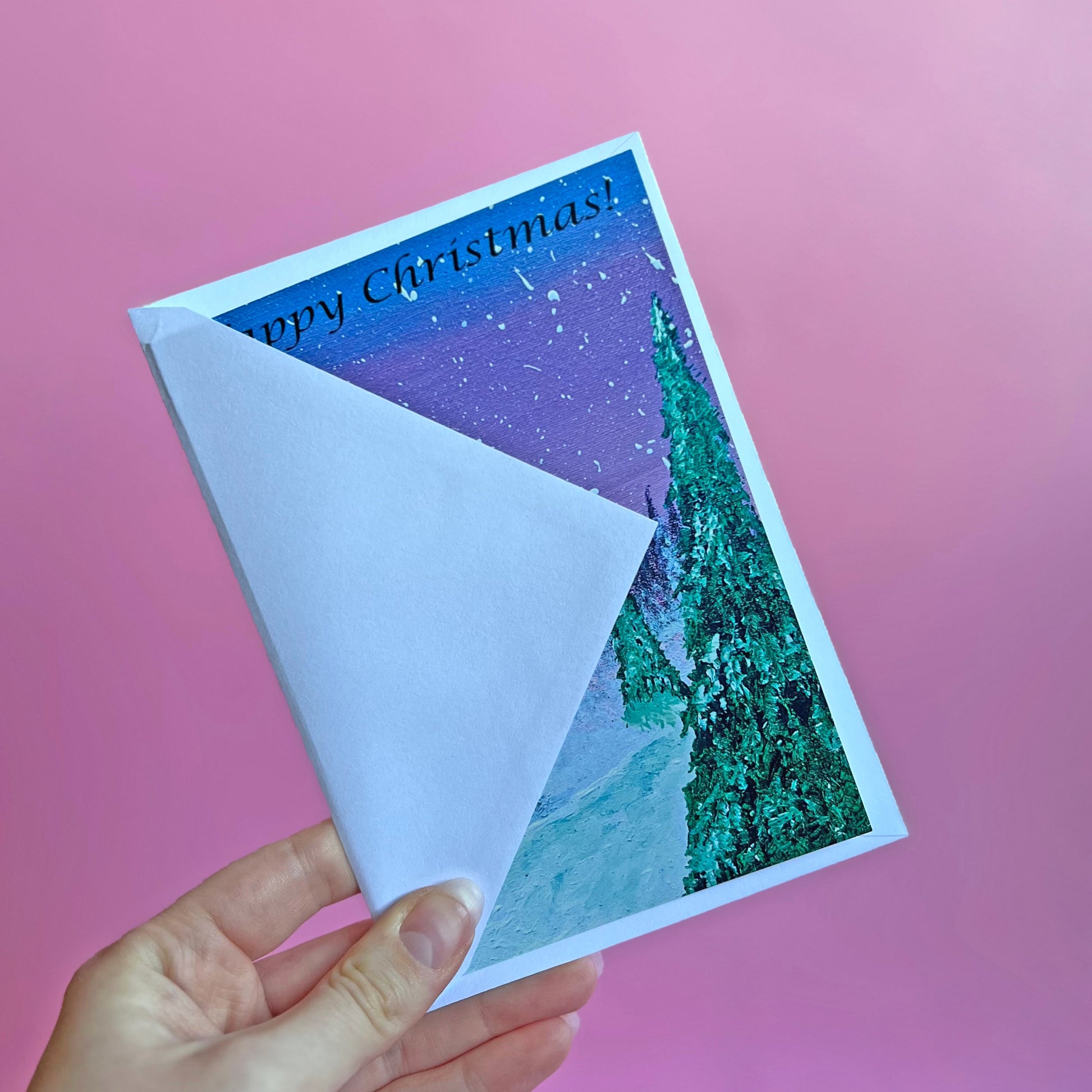 A6 sized (105mm by148mm) 350gsm silk coated white card in portrait with painted design on the front, blank on the inside for your message and with EmAttemptsArt's logo on the back. Comes with envelopes.