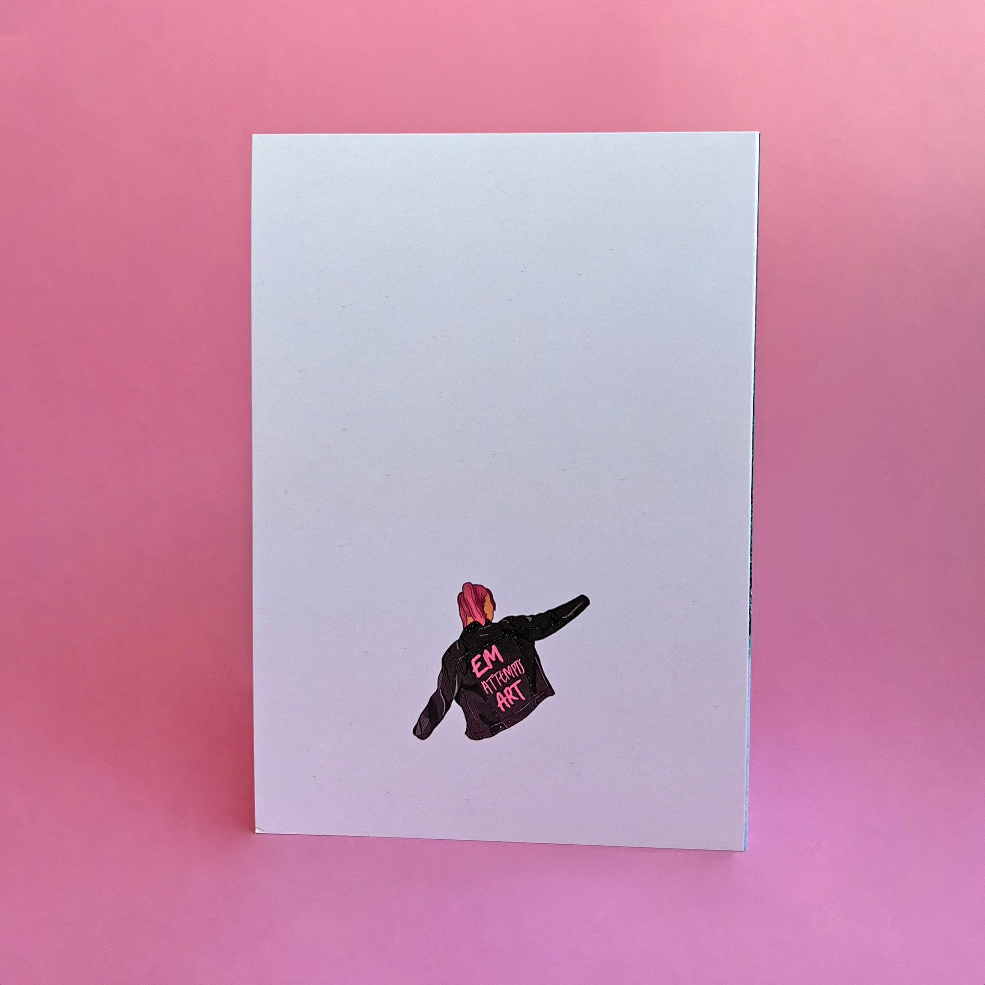 A6 sized (105mm by148mm) 350gsm silk coated white card in portrait with painted design on the front, blank on the inside for your message and with EmAttemptsArt's logo on the back. Comes with envelopes.