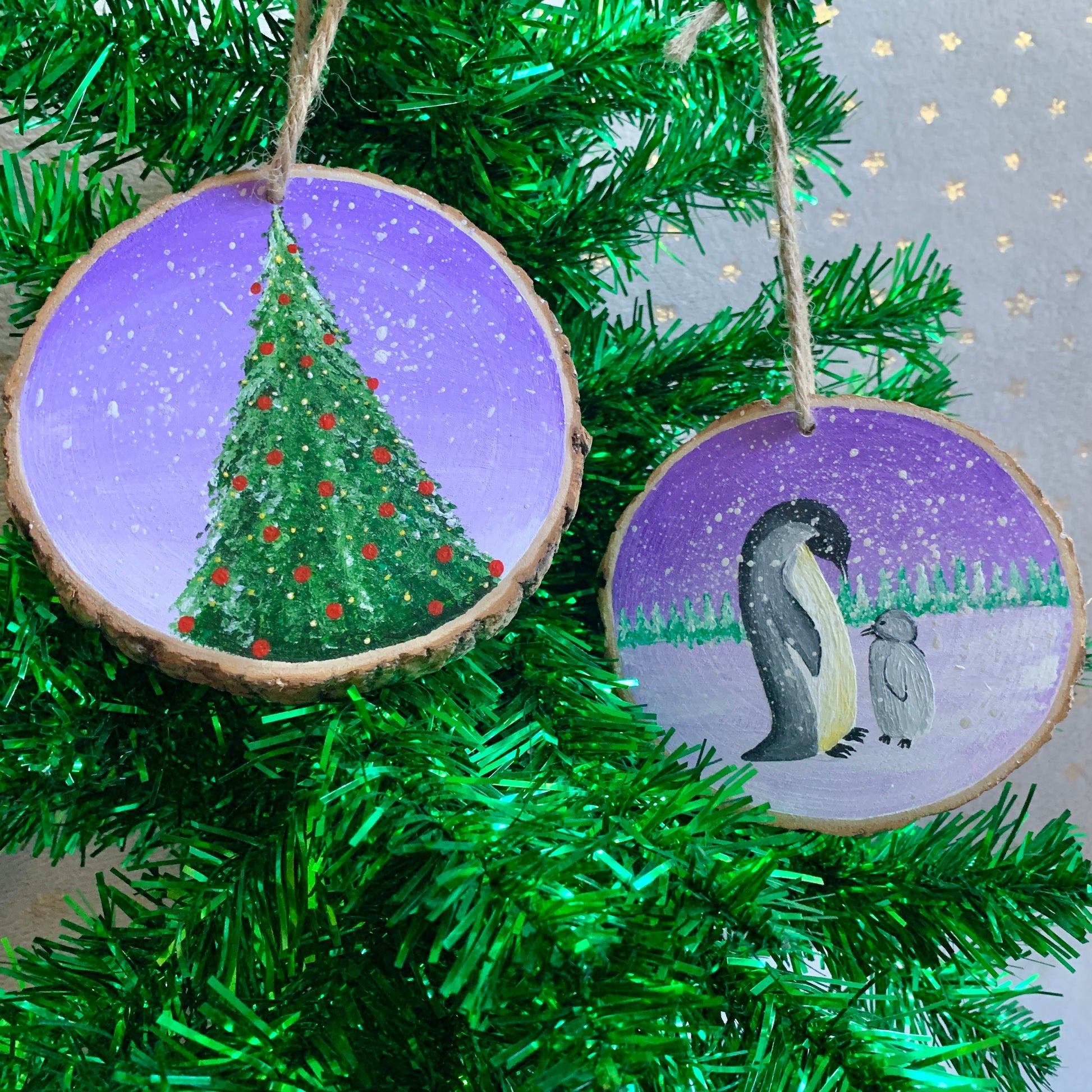 Acrylic painted Christmas bauble, hanging wooden slice, cute Xmas home decor or Christmas tree decoration!