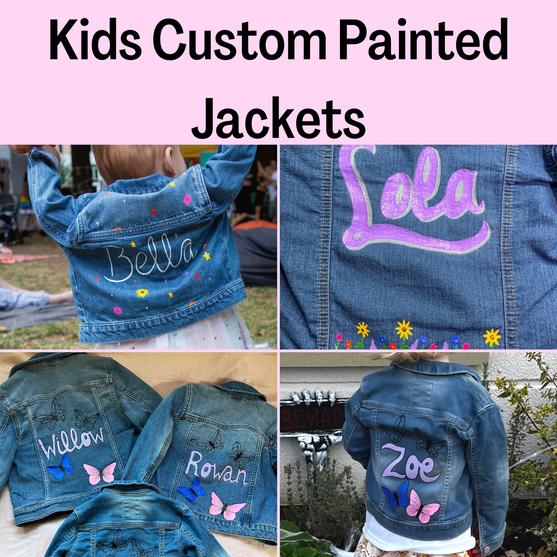 Kids custom made, hand painted, personalised unisex denim jackets!
