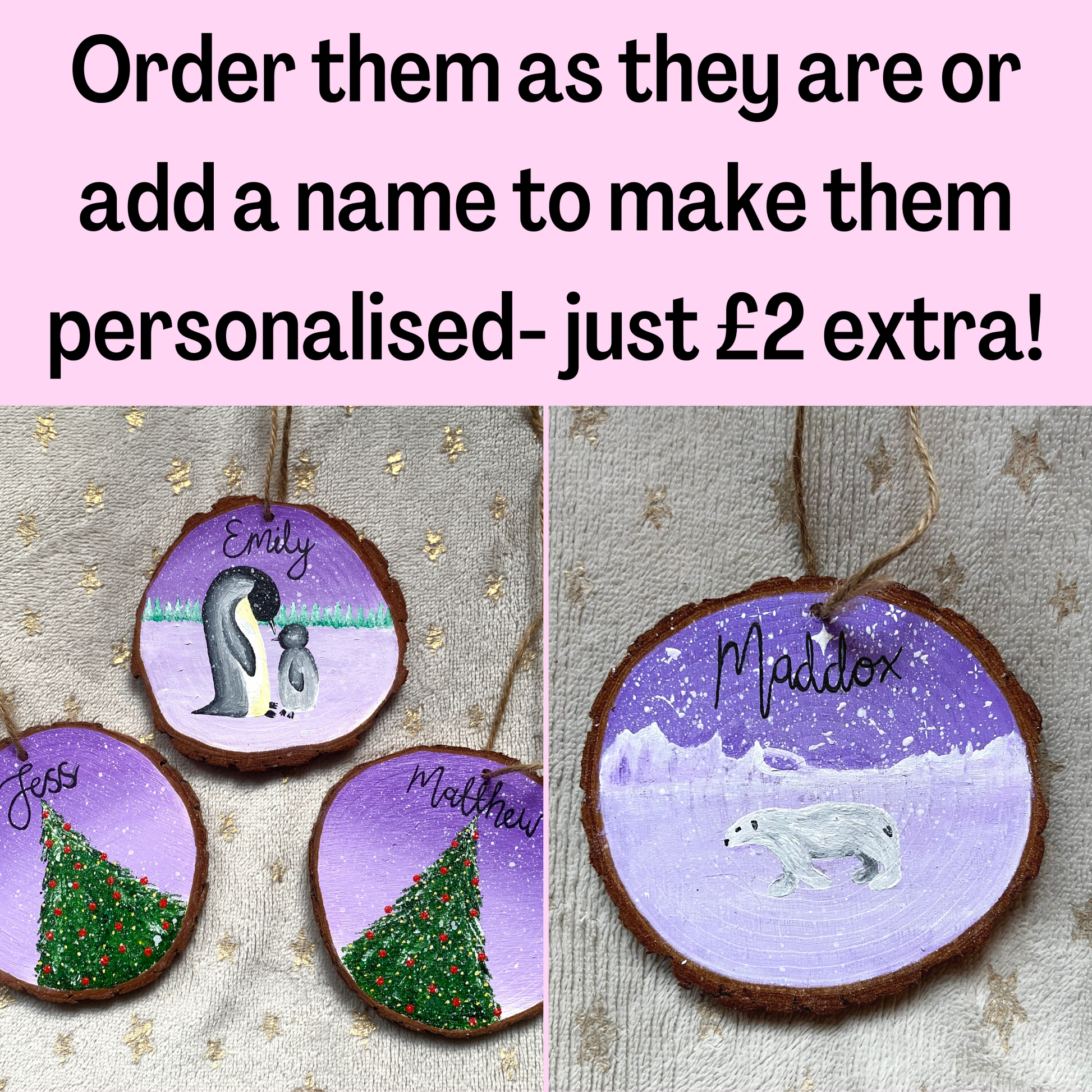 If you'd like to add a personalised touch, just put the name, or names, in the box (please state which design you'd like which name on) and order the personalised option! Just £2 extra (per decoration).
